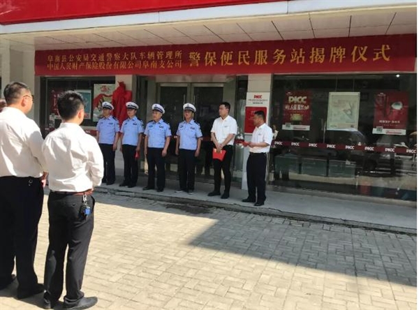 6月7日上午,阜南县公安局交通警察大队与人保财险阜南分公司联合建设的全县首家“警保便民服务站”揭牌仪式在我县人保财险分公司举行,阜南县交警大队副队长陈建军、副教导员李振、车管所负责人汪浩、车管所指导员